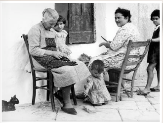 La realtà così com’è, anzi, com’era, di un’Italia ancestrale, tradizionale nel senso più profondo; c’è la fissità degli sguardi dei villani, sulla soglia delle loro case di Frusci, rotti dalla fatica, quasi mitici, nel richiamo di un tempo sempre eguale a sé stesso e quindi a-storico. E ancora il caso del dio Vulcano che affiora nell’antro della sua fucina sotto le spoglie di un fabbro – si era a Miglionico nel 1963. Nonna e nipotina che preparano la conserva: e qui lo scatto assume il valore di un ritratto psicologico; ritratto di ambiente, storia, un quadro di relazioni parentali ben definite come per il gruppo di donne di tutte le età sull’uscio sgangherato della loro abitazione. Stanno pulendo peperoni e melanzane. Accadeva nel 1955 in un paesino della Puglia.