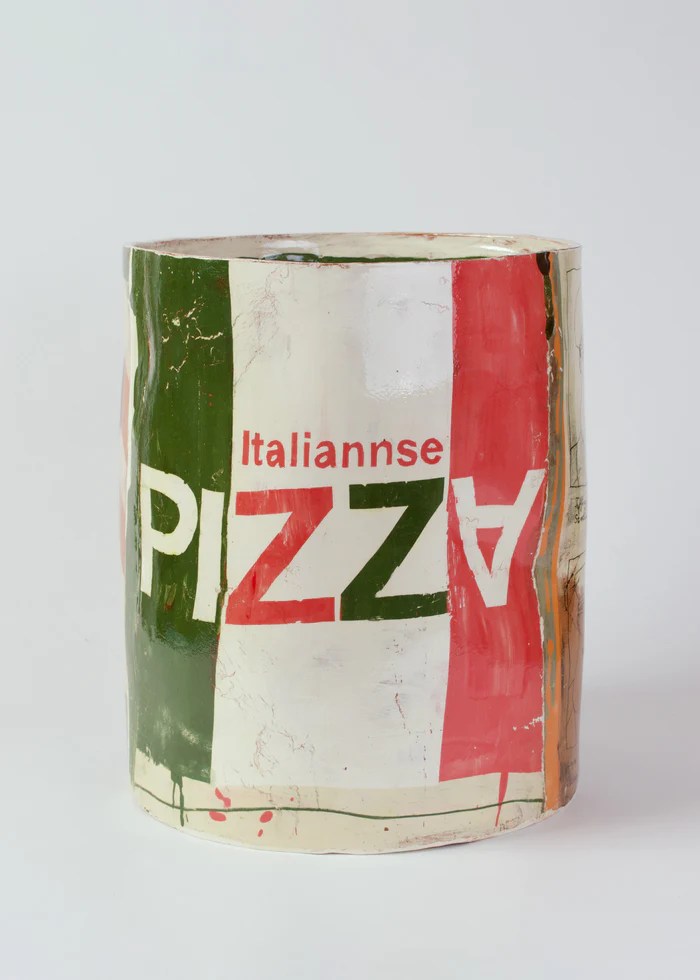 Ignoriamo se la raffigurazione di uno dei nostri cibi nazionali su un contenitore in ceramica alto 45 centimetri e largo 38 sia ispirata a garbata satira o ad altro, in ogni caso lo intendiamo come un omaggio all’Italia e alle sue eccellenze.