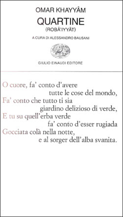 Le QUARTINE con prefazione e versioni dall’originale persiano di Alessandro Bausani sono una riscoperta di cui vale la pena parlare (l’edizione è dell’anno 1963 e la sovra copertina, ahimè, è ingiallita.