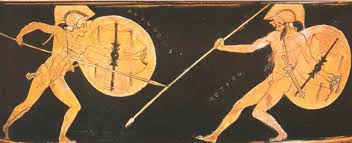 Stanno ancora agitando spada e lancia cercando di darsi la morte. C’è un’ombra che si allunga e che trapassa i secoli, l’ombra del legno di orniello su cui s’innesta la lancia di ferro, che trafigge il tempo. Ancora si danno battaglia, nutriti di odio assetati di vendetta. Attori di una contesa che sembra non finire mai. Mitici. Quell’ombra lunghissima, che si proietta a terra, giunge sino a noi, dopo millenni. Seguendola a ritroso scopriamo che è l’ombra fatta dal giavellotto di Achille, scagliato inutilmente contro Ettore e raccolto dalla rapida mano di Athena, alleata dell’eroe troiano. Achille e Ettore, titani piegati al volere degli dei.